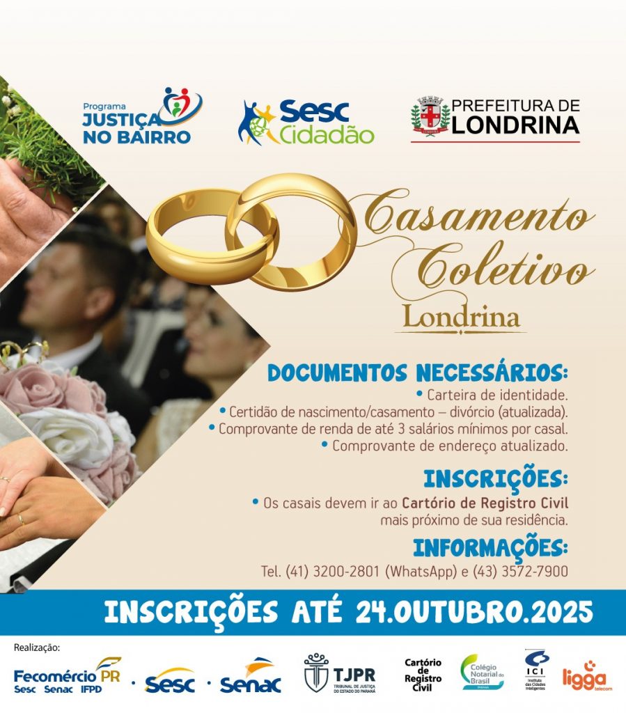 A Prefeitura de Cambé, em parceria com a Prefeitura de Londrina e outros municípios da região, participa do Casamento Civil Coletivo 2025. O evento é promovido pelo Programa Justiça no Bairro Sesc Cidadão, do Tribunal de Justiça do Paraná (TJ-PR) e Sistema Fecomércio Sesc Senac PR. O casamento será no dia 1º de novembro, às 16h, no SESC Londrina Norte gratuitamente. Essa ação visa oficializar a união de casais com renda de até três salários mínimos, proporcionando acesso à cidadania e segurança jurídica.