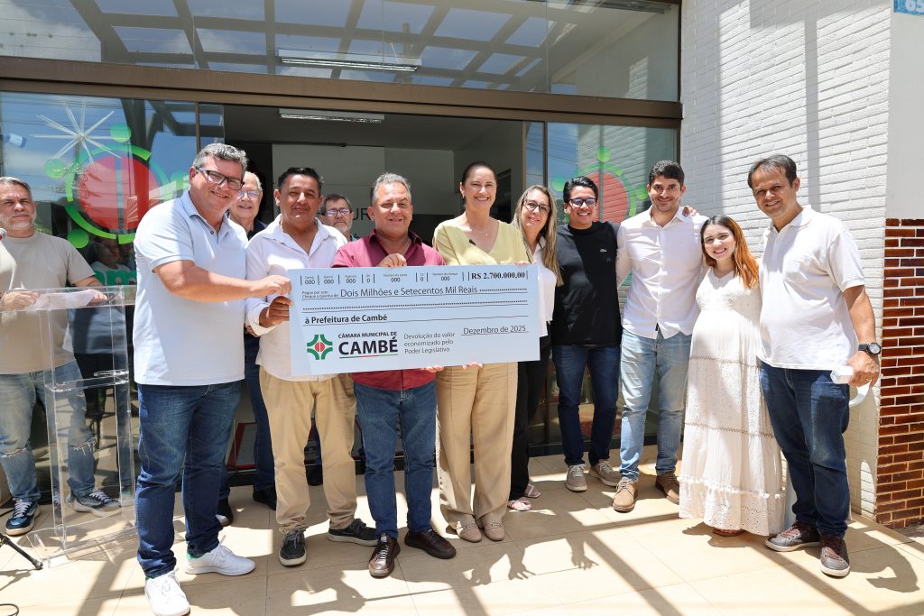 O evento também contou com a devolução de R$ 2,7 milhões economizados pela Câmara Municipal à Prefeitura. Os vereadores de Cambé entregaram um cheque simbólico ao prefeito Conrado Scheller, representando a responsabilidade com o dinheiro público, e o compromisso com a transparência. O montante poderá ser utilizado pela Administração Pública em benefícios para a população.